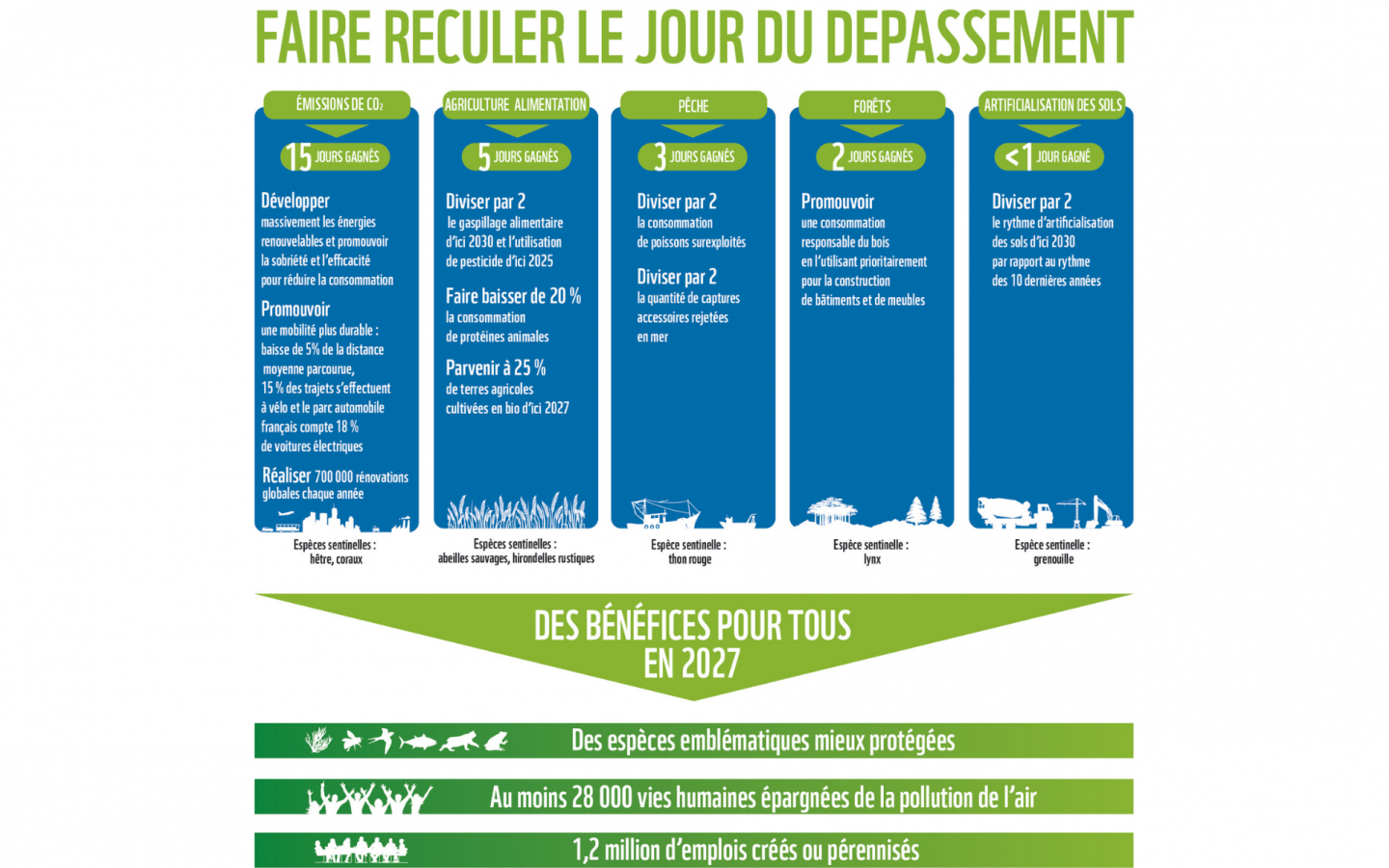 Faire reculer le jour de dépassement, c’est aussi permettre de sauver d’ici 2027 au moins 28 000 vies humaines de la pollution de l’air aux particules fines et de soutenir plus d’1,2 millions d’emplois grâce aux investissements effectués dans la transition écologique.